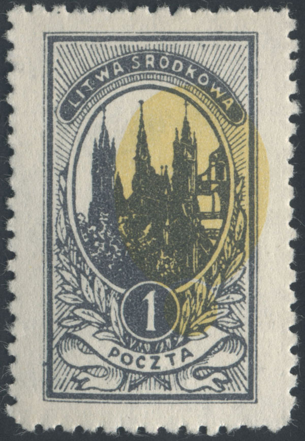 1921 wydanie na rzecz Polskiego Białego Krzyża - Katedra z wieżą, niekatalogowany błędnodruk znaczka za 4 mk. w kolorze oliwkowoszarym bez tła, pięknie perforowany, gumowany, bardzo starannie drukowany (nie wykluczone, że to próbny druk), zachowany w pięknym stanie z jedną lekką podlepką, w handlu niespotykany, gwarancja Walocha. | Fi.32B (P) |
