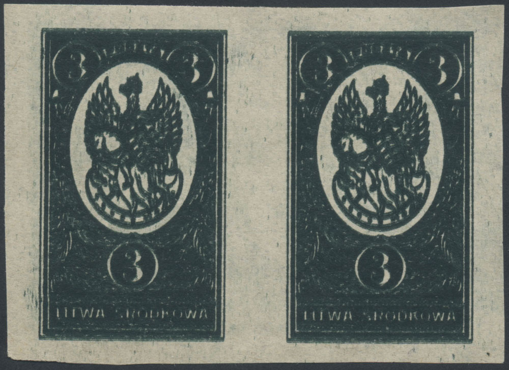 1921 Pogoń na tle Orła Białego, makulatura znaczka za 3 mk., druk potrójny i odwrócony druk podwójny, przy wielokrotnym druku rysunek czytelny, gwarancja i oznaczenie MK. | Fi.32A MK Mi.36B |