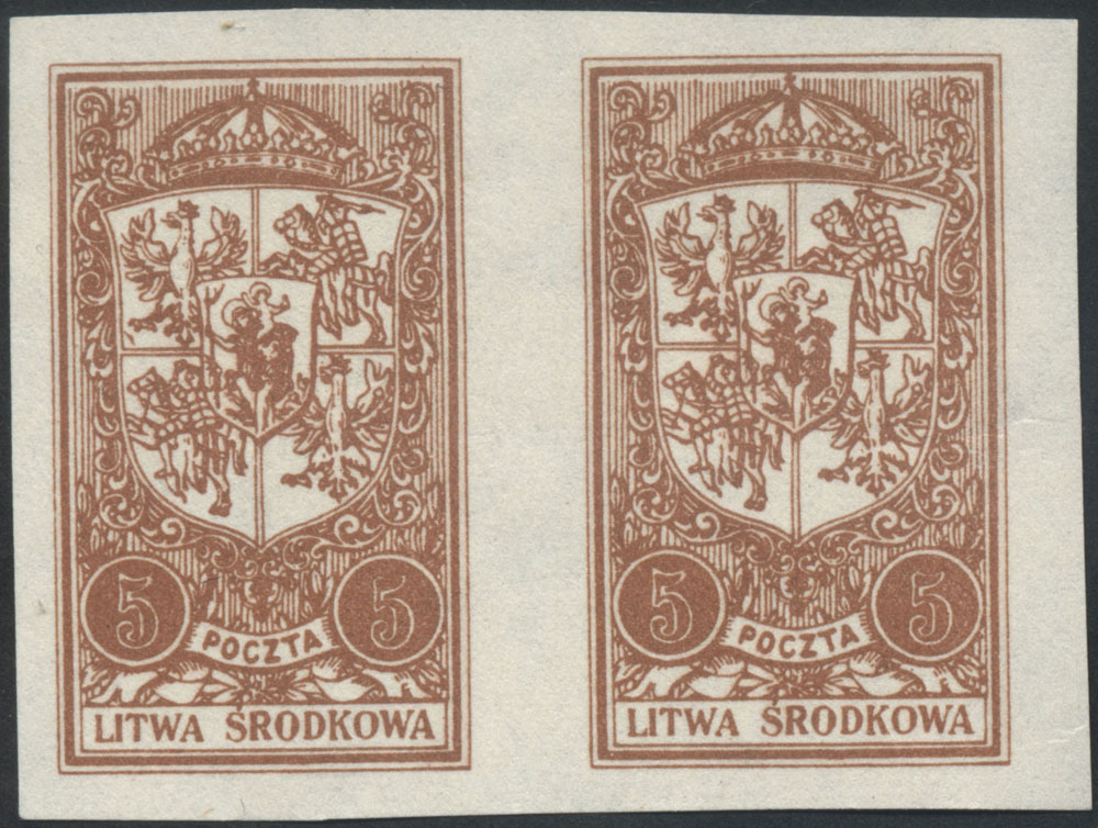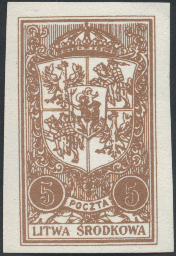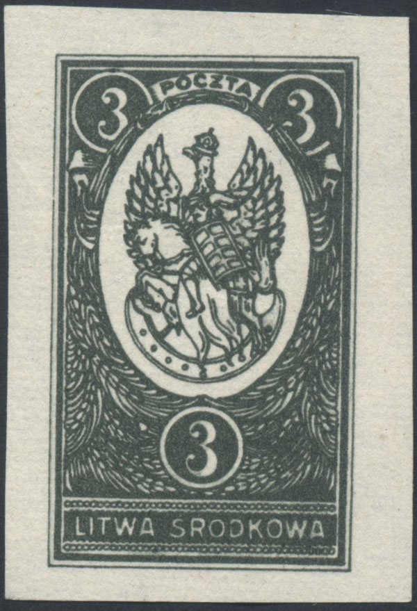 1921 wydanie na rzecz Polskiego Białego Krzyża - Gen.l.Żeligowski, makulatura próby znaczka za 10 mk. z wzajemnie przesuniętymi kolorami szarobrązowym i żółtym, na niegumowanym białym średnim papierze o grubości 0,08 mm, gwarancja. | Fi.33 P2 MK Mi. |
