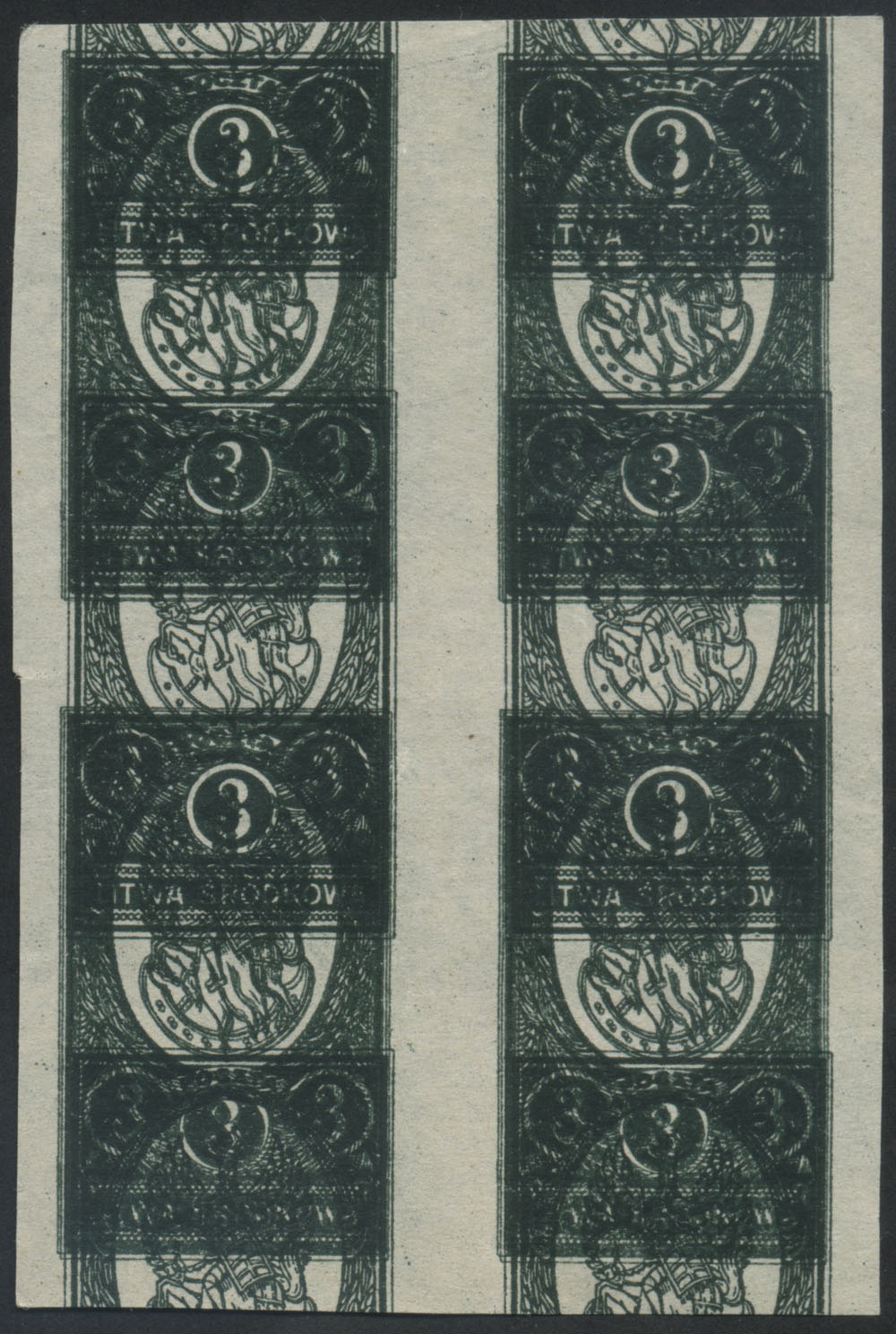 1921 Pogoń na tle Orła Białego, makulatura znaczka za 3 mk., pięciokrotny w tym wzajemnie odwrócony druk, gwarancja Krawczyk. | Fi.36A MK Mi.36B |