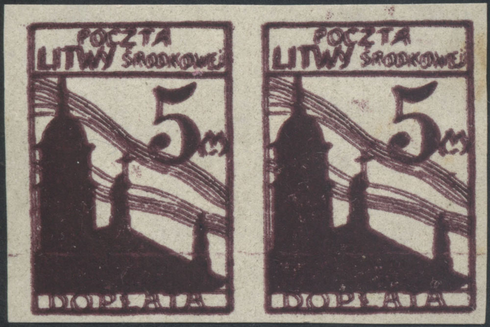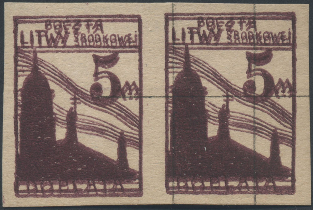 1922 otwarcie Sejmu Litwy Środkowej, podwójny wzajemnie odwrócony druk próby znaczka za 10 mk. w kolorze żółtobrązowym na kremowym papierze (Fi.300.-), lekko zgięta, gwarancja. | Fi.44 P8 Dp |