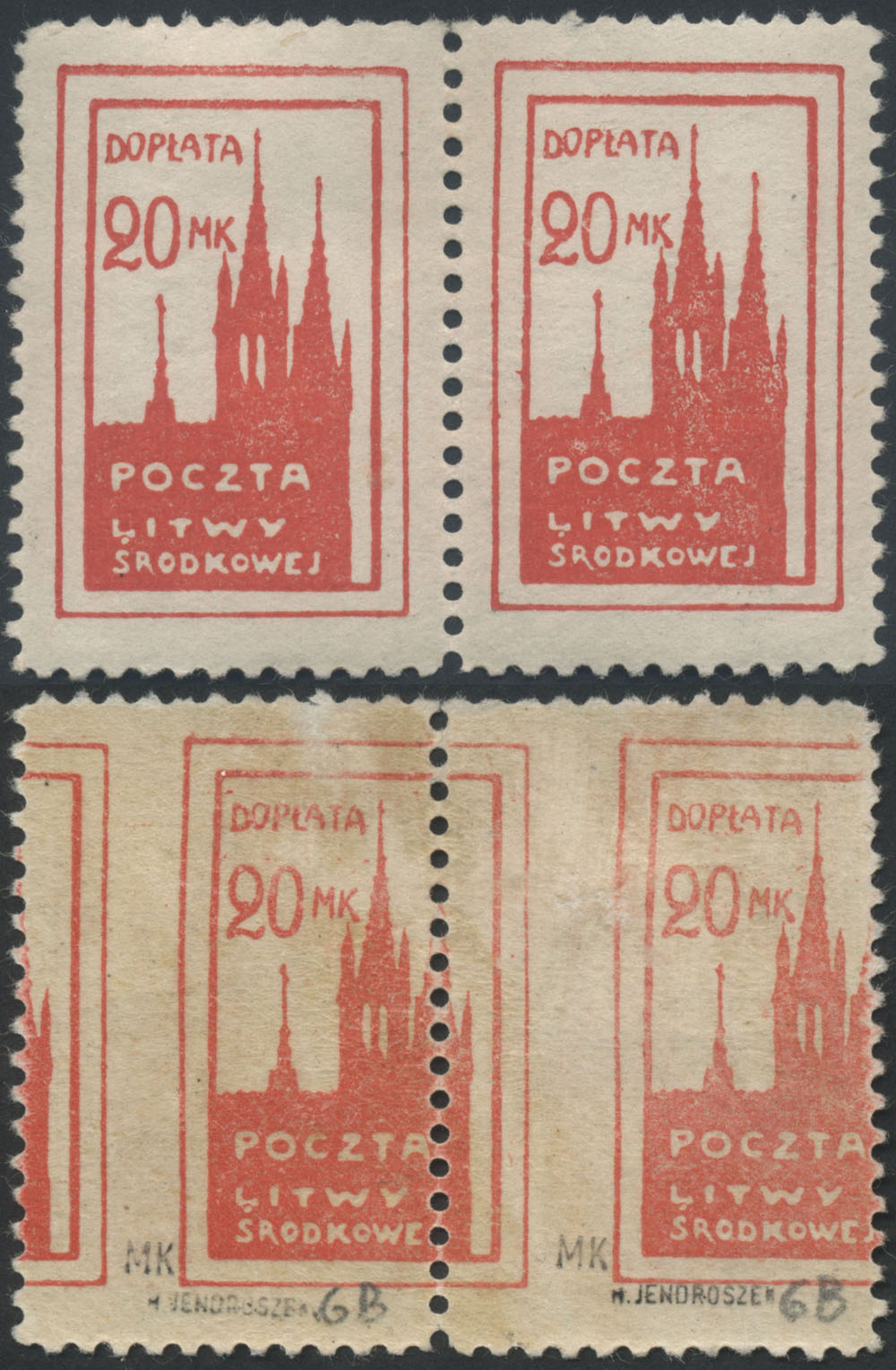 1921 Kościół Św.Anny w Wilnie, druk potrójny próby znaczka dopłaty za 20 mk. na białym papierze prążkowanym pionowo - ma oznaczenie nominału małymi literami i podwójny napis POCZTA LITWY ŚRODKOWEJ, gwarancja Krawczyk. | Fi.D6 P1 Dpt |