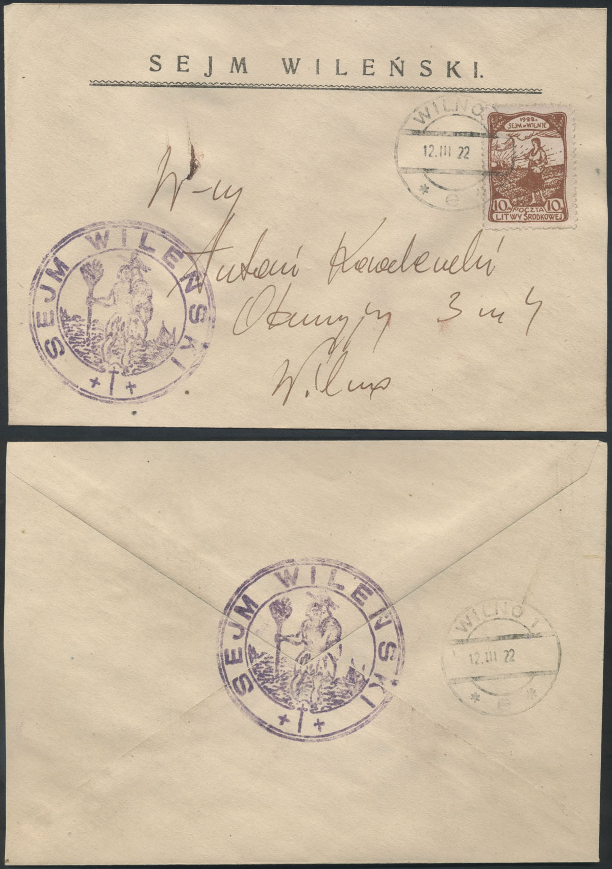 1922 otwarcie sejmu Litwy Środkowej, pamiątkowy miejscowy list nadany 12.03.21 na kopercie sejmowej ze stempel sejmu. | Fi.44B |