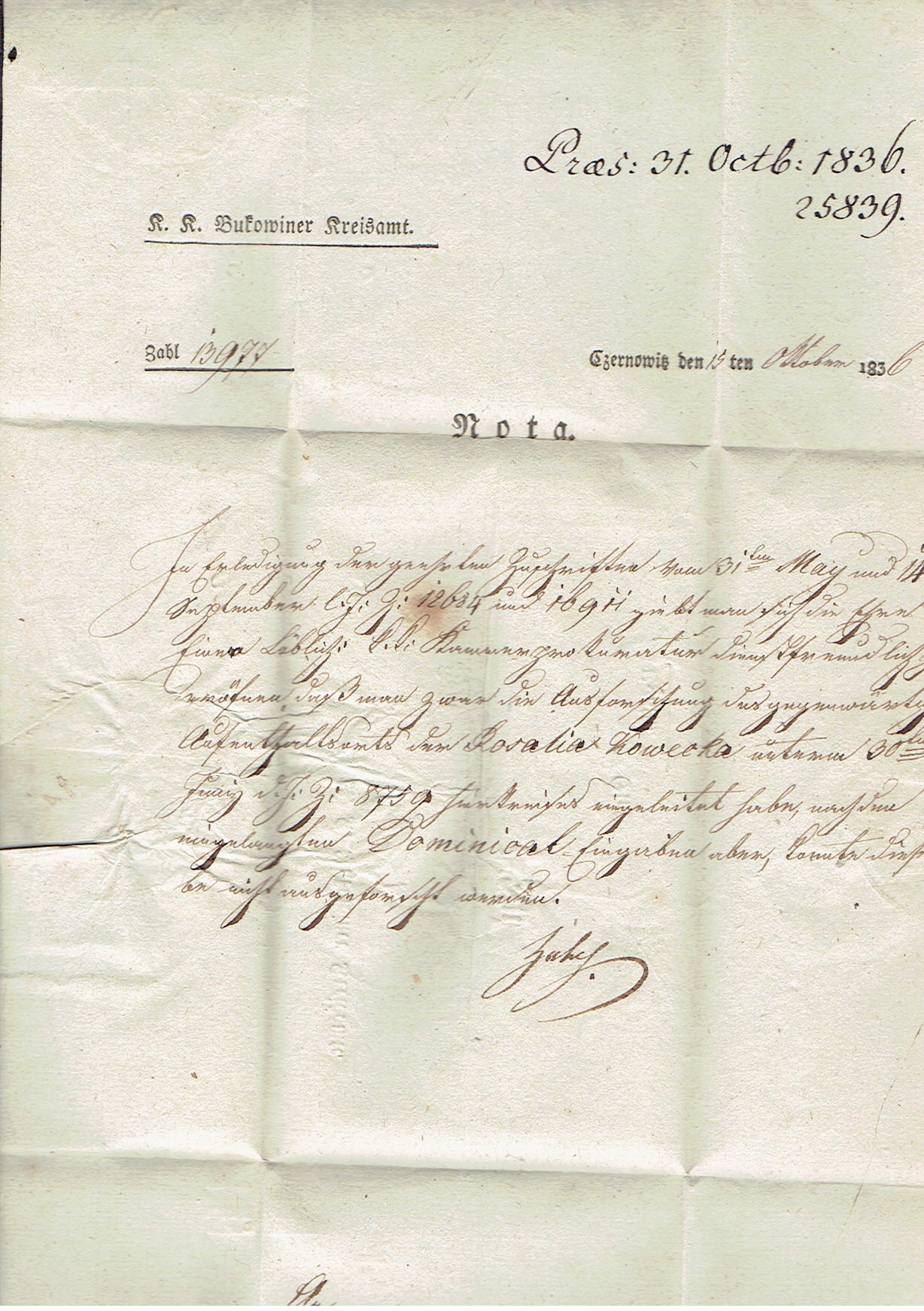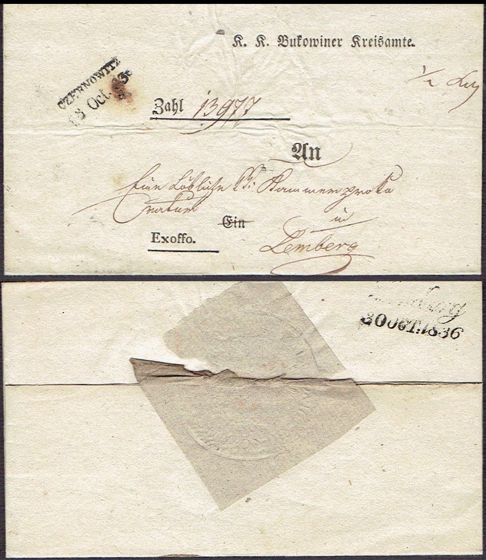 1836 Czernowitz, kompletny list składany wysłany z Czernowic do Lwowa, stempel odbiorczy z Lemberg. | |