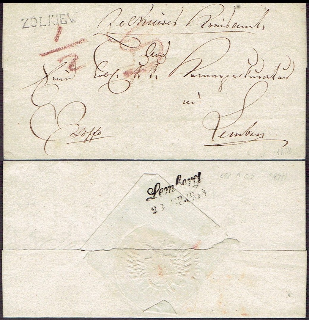 1838 Zolkiew (Żółkiew), kompletny list składany wysłany z Żółkwi do Lwowa. | |