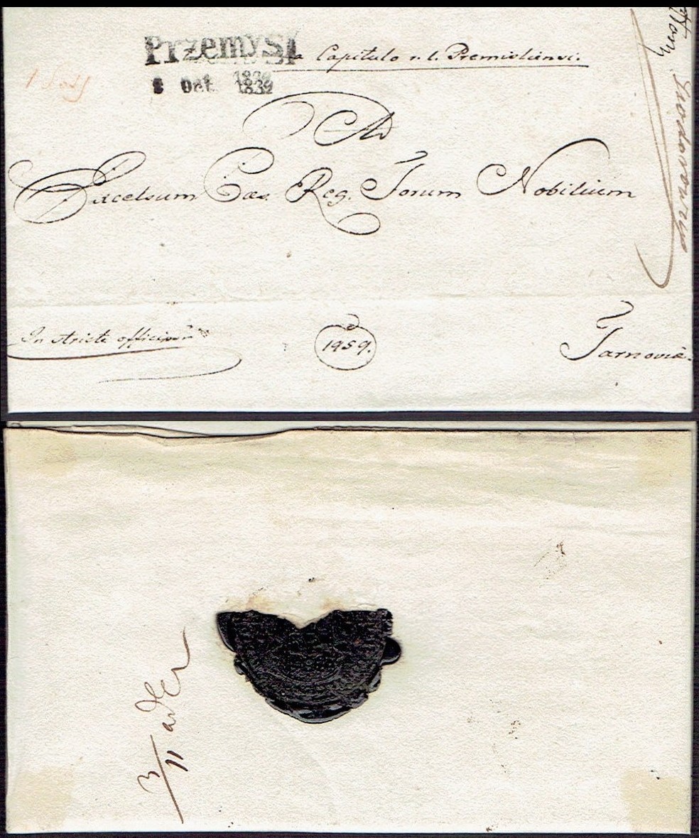 1836 LWÓW - kompletny z pełną treścią list urzędowy (datowany 7 listopada) wysłany ze Lwowa do Przemyśla, czarny jednowierszowy stempel nadawczy LEMBERG, zaznaczono wagę przesyłki - pół łuta; na odwrocie zalepka nadawcy z dodatkową, co rzadkie, pieczęcią lakową; bardzo dobry stan zachowania. | |