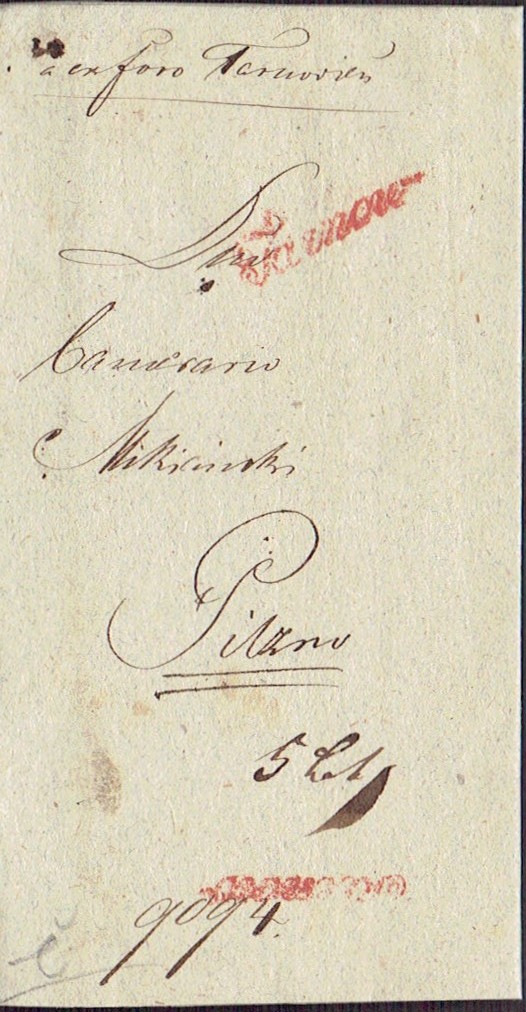 1836 PRZEMYŚL - kompletny list (datowany 3 lipca) wysłany z Przemyśla do Sambora, nadawca wpisał i podkreślił nazwę miejscowości, z której przesyłka została wysłana, dodatkowo odciśnięto czarny jednowierszowy w ramce stempel nadawczy PRZEMYSL, list na froncie przekreślono ukośnie; słabszy stan zachowania (ślady korników). | |