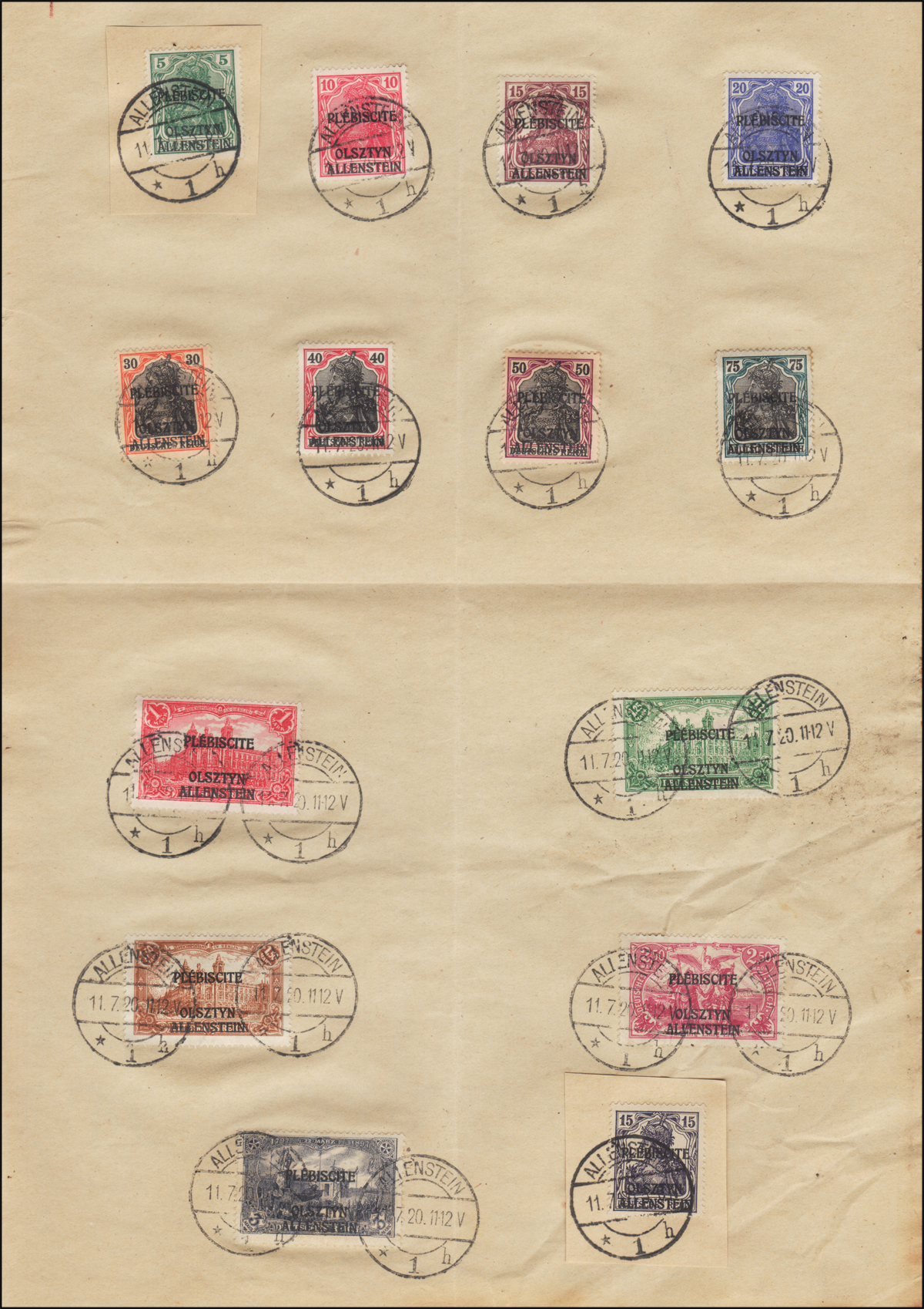 1920 Olsztyn, I wydanie plebiscytowe, seria 14 znaczków, 12 sztuk ostemplowanych na karcie, dwa na wycinkach (doklejone), wszystkie skasowane 11.7 tym samym olsztyńskim datownikiem ALLENSTEIN z wyróżnikiem "*1h" | Fi.1-14 |