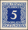 1920 wydanie Polskiej Rady Narodowej dla Księstwa Cieszyńskiego, nie wprowadzony do obiegu znaczek dopłaty za 5 hal. w barwie ciemnoniebieskiej na papierze białym gładkim średnim, wzór "cyfry" projektu prof. W. Zarzyckiego, podlepka, gwarancja i oznaczenie Walocha. | Fi.Dx1 |