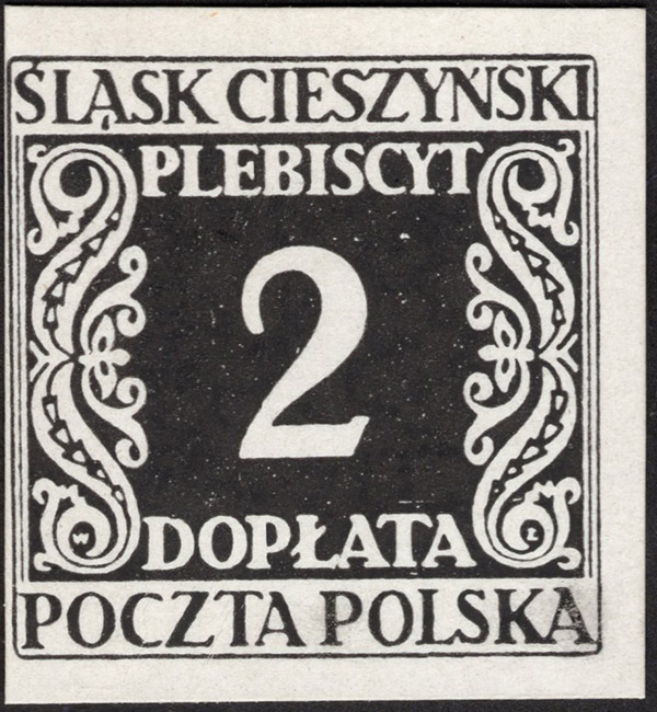 1920 wydanie Polskiej Rady Narodowej dla Księstwa Cieszyńskiego, nie wprowadzony do obiegu znaczek dopłaty za 2 hal. w barwie czarnej na papierze białym kredowanym grubym, wzór "cyfry" projektu prof. W. Zarzyckiego, podlepka, gwarancja i oznaczenie Walocha. | Fi.Dx2 |