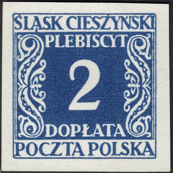 1920 wydanie Polskiej Rady Narodowej dla Księstwa Cieszyńskiego, nie wprowadzony do obiegu znaczek dopłaty za 2 hal. w barwie ciemnoniebieskiej na papierze białym gładkim średnim, wzór "cyfry" projektu prof. W. Zarzyckiego, gwarancja i oznaczenie Walocha. | Fi.Dx1 |
