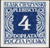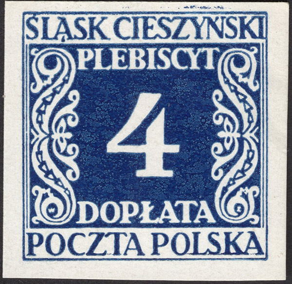 1920 wydanie Polskiej Rady Narodowej dla Księstwa Cieszyńskiego, nie wprowadzony do obiegu znaczek dopłaty za 4 hal. w barwie ciemnoniebieskiej na papierze białym grubym kredowanym, wzór "cyfry" projektu prof. W. Zarzyckiego, gwarancja i oznaczenie Walocha. | Fi.Dx2 |