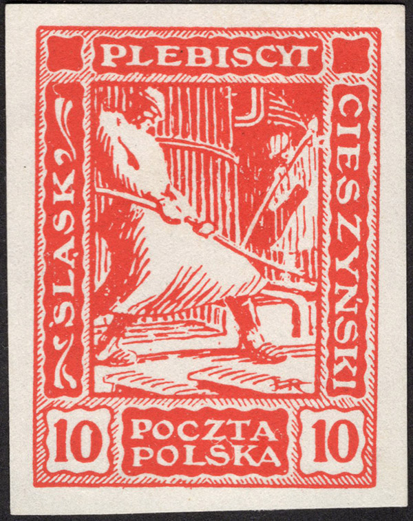 1920 Śląsk Cieszyński, wydanie Polskiej Rady Narodowej dla Księstwa Cieszyńskiego, nie wprowadzony do obiegu znaczek opłaty za 10 hal. w barwie czerwonej na papierze białym gładkim średnim, wzór "hutnik" projektu prof. J. Raszki, gwarancja i oznaczenie Walocha. | Fi.IIIx1 |