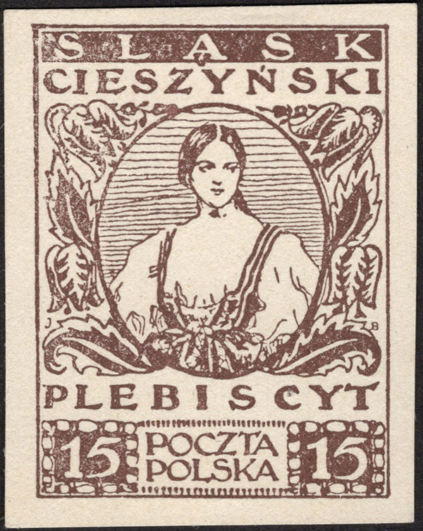 1920 wydanie Polskiej Rady Narodowej dla Księstwa Cieszyńskiego, nie wprowadzony do obiegu znaczek opłaty za 15 hal. w barwie czarnobrunatnej na papierze białym gładkim średnim, wzór "Ślązaczka dziewczyna" projektu prof. J. Bukowskiego, odmiana I - znak diakrytyczny Ą częściowo pod tłem, a wszystkie linie tła dochodzą do owalu, podlepka, gwarancja i oznaczenie Walocha. | Fi.IVx1 |