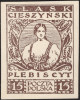 1920 wydanie Polskiej Rady Narodowej dla Księstwa Cieszyńskiego, próba nie wprowadzonego do obiegu znaczka opłaty za 25 hal. w rzadkim kolorze czarnobrunatnym na papierze białym kredowanym grubym - wzór "Herb Śląska Cieszyńskiego" projektu Prof.J.Bukowskiego, próba ta tzw. odmiana IIa z przerwaną ramką pod literą L słowa PLEBISCYT pochodzi z sześcioznaczkowego arkusika zawierającego próby znaczków o różnych nominałach 2, 3, 5, 15, 25 i 50, poza małą prześwitką po podlepce w ładnym stanie, gwarancja Krawczyk. | Fi.VIx2 |