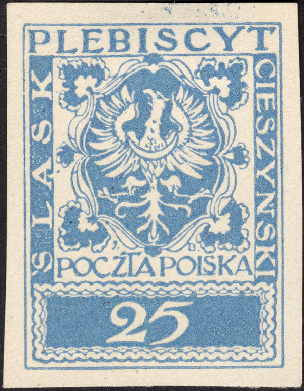 1920 wydanie Polskiej Rady Narodowej dla Księstwa Cieszyńskiego, nie wprowadzony do obiegu znaczek opłaty za 25 hal. w barwie błękitnoniebieskiej na papierze białym gładkim średnim, wzór "herb Śląska Cieszyńskiego" projektu prof. J. Bukowskiego, odmiana II z przerwaną ramką pod literą L słowa PLEBISCYT, podlepka, gwarancja i oznaczenie Walocha. | Fi.VIx1 |