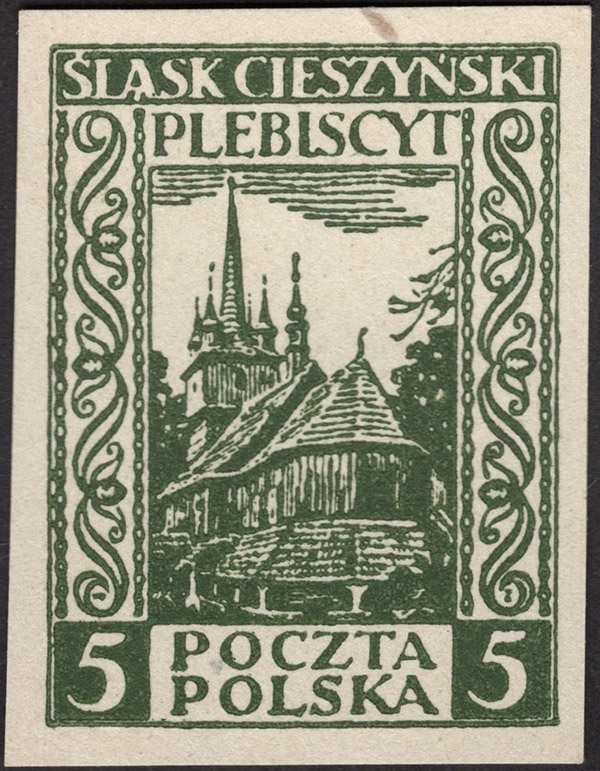 1920 wydanie Polskiej Rady Narodowej dla Księstwa Cieszyńskiego, nie wprowadzony do obiegu znaczek opłaty za 5 hal. w barwie ciemnozielonej na papierze białym gładkim średnim, wzór "kościół w Komorowicach" projektu prof. W. Zarzyckiego, gwarancja i oznaczenie Walocha. | Fi.IIx1 |