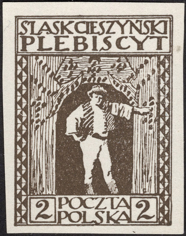 1920 Śląsk Cieszyński, wydanie Polskiej Rady Narodowej dla Księstwa Cieszyńskiego, nie wprowadzony do obiegu znaczek opłaty za 2 hal. o barwie brunatnej na papierze białym gładkim średnim, wzór "góral na progu chaty" projektu prof. J. Czajkowskiego, gwarancja i oznaczenie Walocha. | Fi.1x1 |