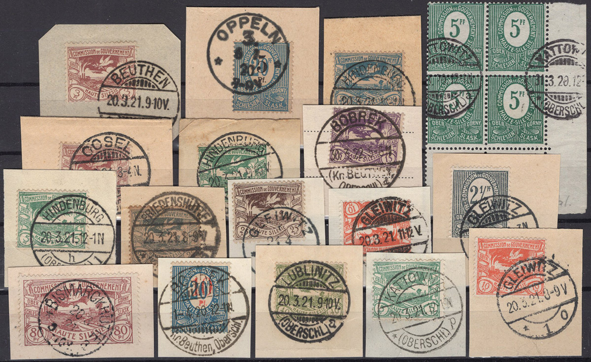 1921 Górny Śląsk, wydanie okolicznościowe z okazji plebiscytu, seria pięknie kasowanych znaczków (Fi.1500.-) na wycinkach, gwarancja Schmutz. | Fi.30-40 |