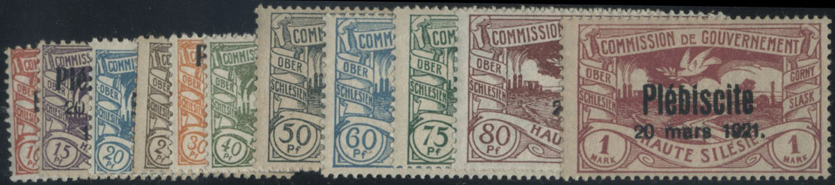 1921 Górny Śląsk, seria wydania przedrukowego z okazji plebiscytu w bardzo ładnym stanie, trzy znaczki z abklaczami nadruku, gwarancja Schmutz. | Fi.30-40 |