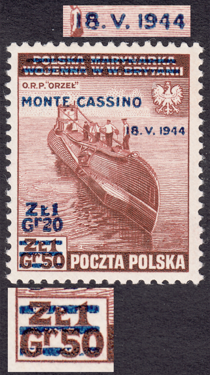 1941 Zdobycie Monte Cassino, znaczek za 1,20/1,50 zł., rzadki na grubszym kremowym papierze x (Fi.300.-), dodatkowo błędy "mocno uszkodzone belki zasłaniający nominał" oraz "mniejsza cyfra 4" - inny wariant niż katalogowany, gwarancja i opis odmiany "pap x" Walocha.