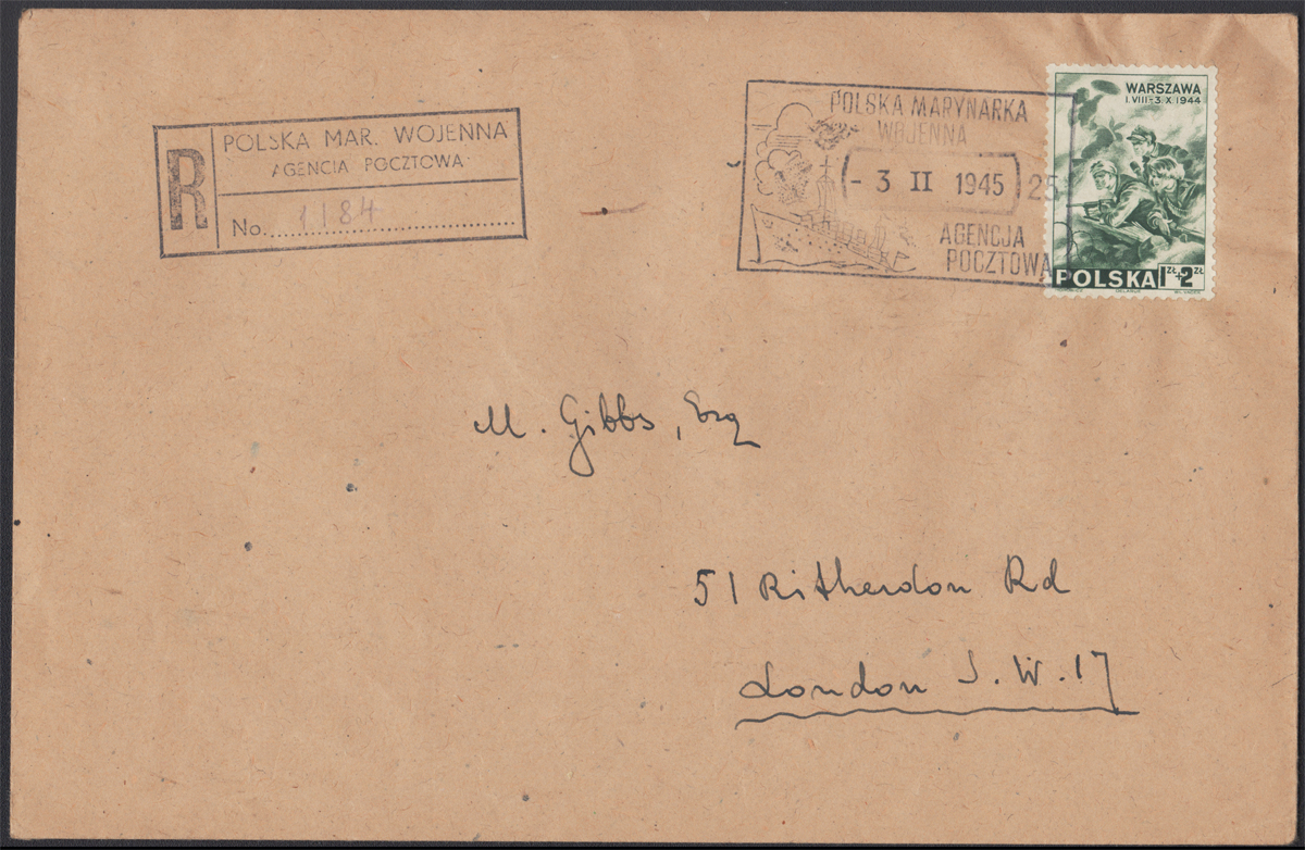 1945 IV wydanie Polskiego Rządu na Emigracji w Londynie z dopłatą na rzecz sierot po powstańcach, znaczek na kopercie grzecznościowo poleconej ostemplowany 3.II gumowym datownikiem typu III w agencji pokładowej nr.25 na okręcie podwodnym ORP "Sokół" w pierwszym dniu obiegu.