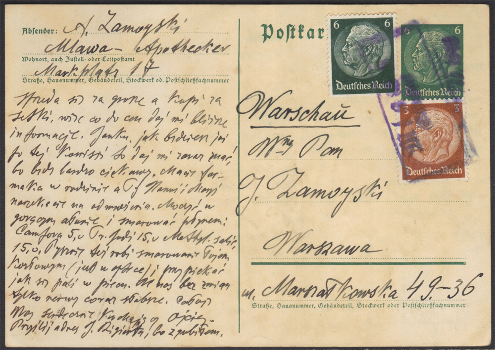 1940 Obszary okupowane przez Niemcy, dofrankowana karta pocztowa Rzeszy datowana 1/II wysłany z Mławy do Warszawy, znaki opłaty skasowane stemplem prowizorycznym, nadawcą jest A.Zamoyski, a przesyłka adresowana J.Zamoyski; dokument nieco pożółkły. | Fi.AnNCp3, AnN2, AnN5 |