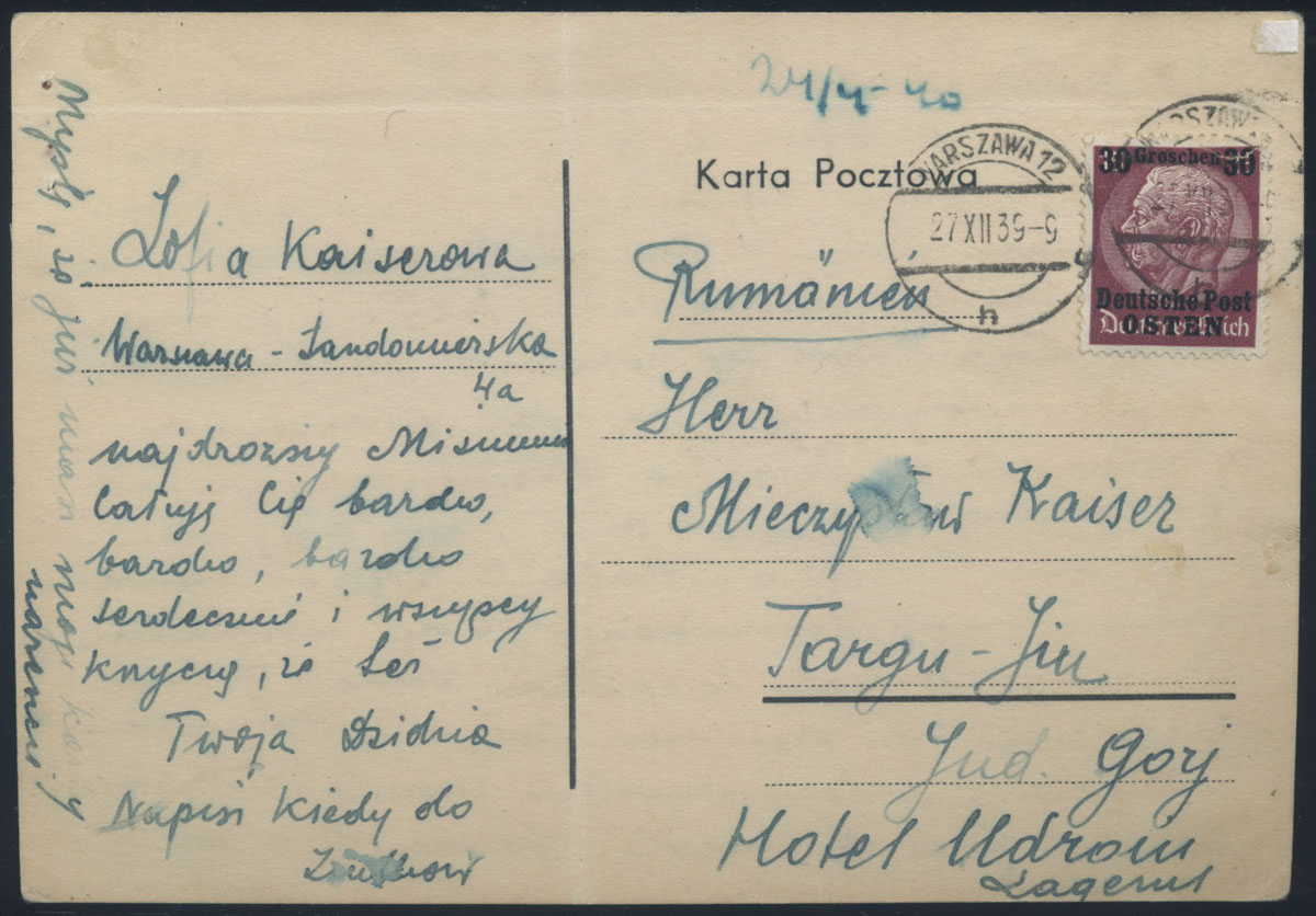 1939 kartka nadana 27.12.39 z warszawy do Rumunii.