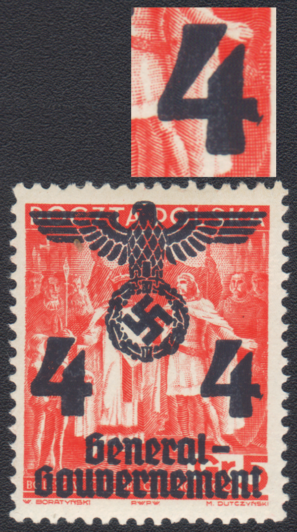 1940 II wydanie przedrukowe, znaczek za 4/5 gr. z błędem na poz.95 "wyrostek na poziomej belce prawej 4" (Fi.350.-); bardzo dobry stan zachowania, gwarancja i opis Walocha. | Fi.18 B6 Mi.18I |