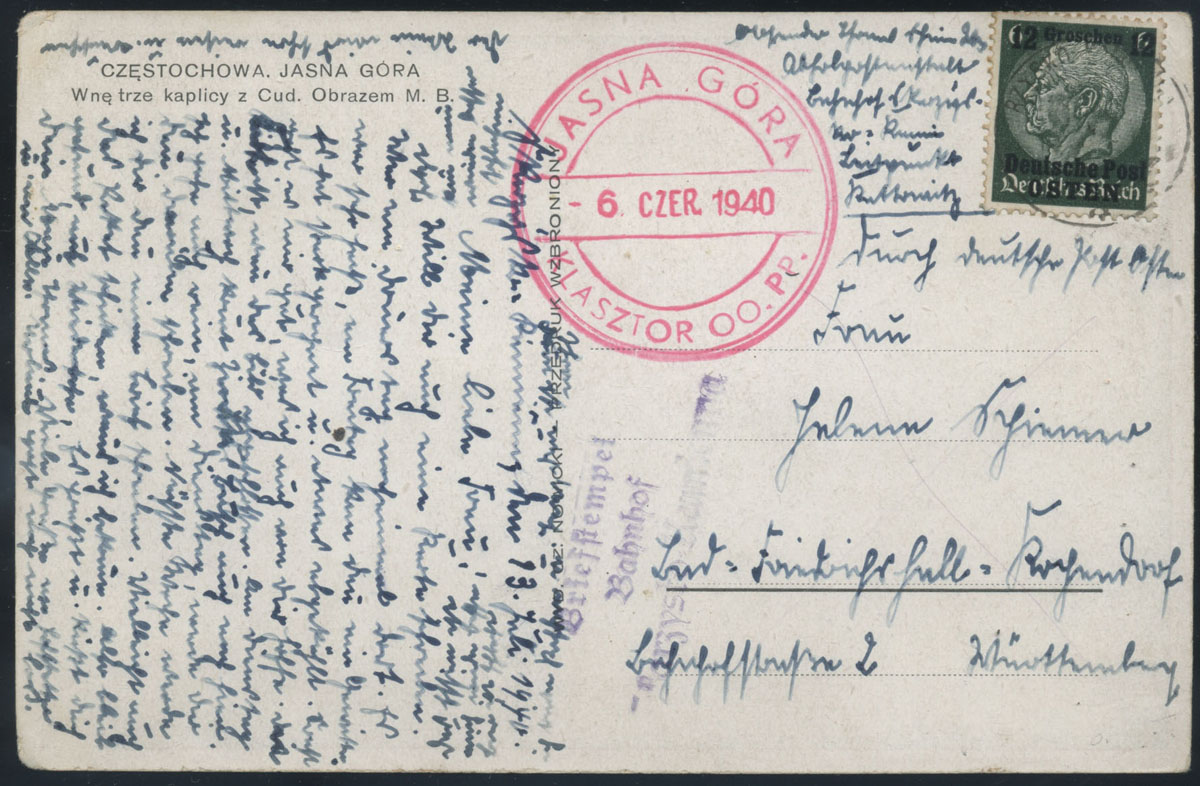 1940 kartka nadana na dworcu w Skarżysku kamiennej do Niemiec, stempel Klasztoru na Jasnej Górze. | Fi.3 |