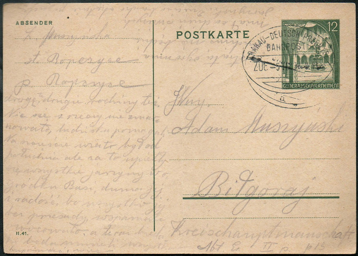 1941 kartka wysłana do Biłgoraja nadana ambulansem kolejowym na trasie Kraków - Przemyśl, stempel "KRAKAU – DEUTSH PRZEMYSL / ZG 516", ślad pionowego załamania kartki . | Fi.Cp7II |