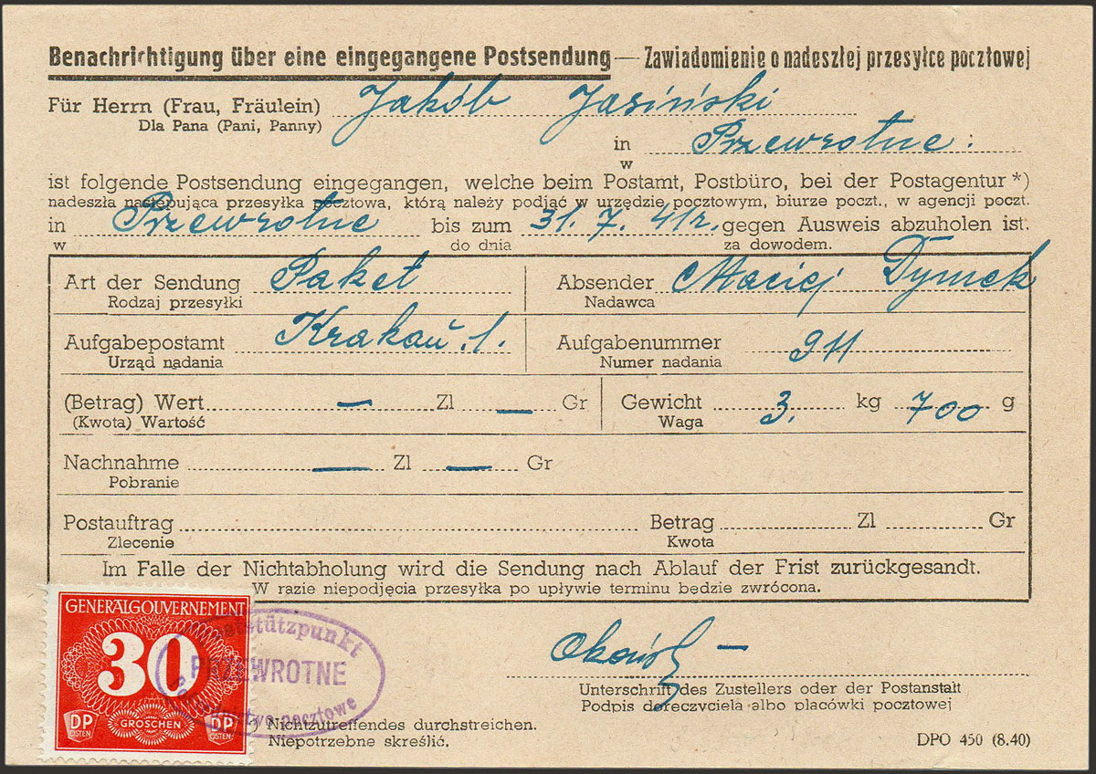 1941 zawiadomienie o nadeszłej przesyłce pocztowej ze znaczkiem doręczeniowym skasowanym stemplem pośrednictwa pocztowego przewrotne. | Fi.D3 |