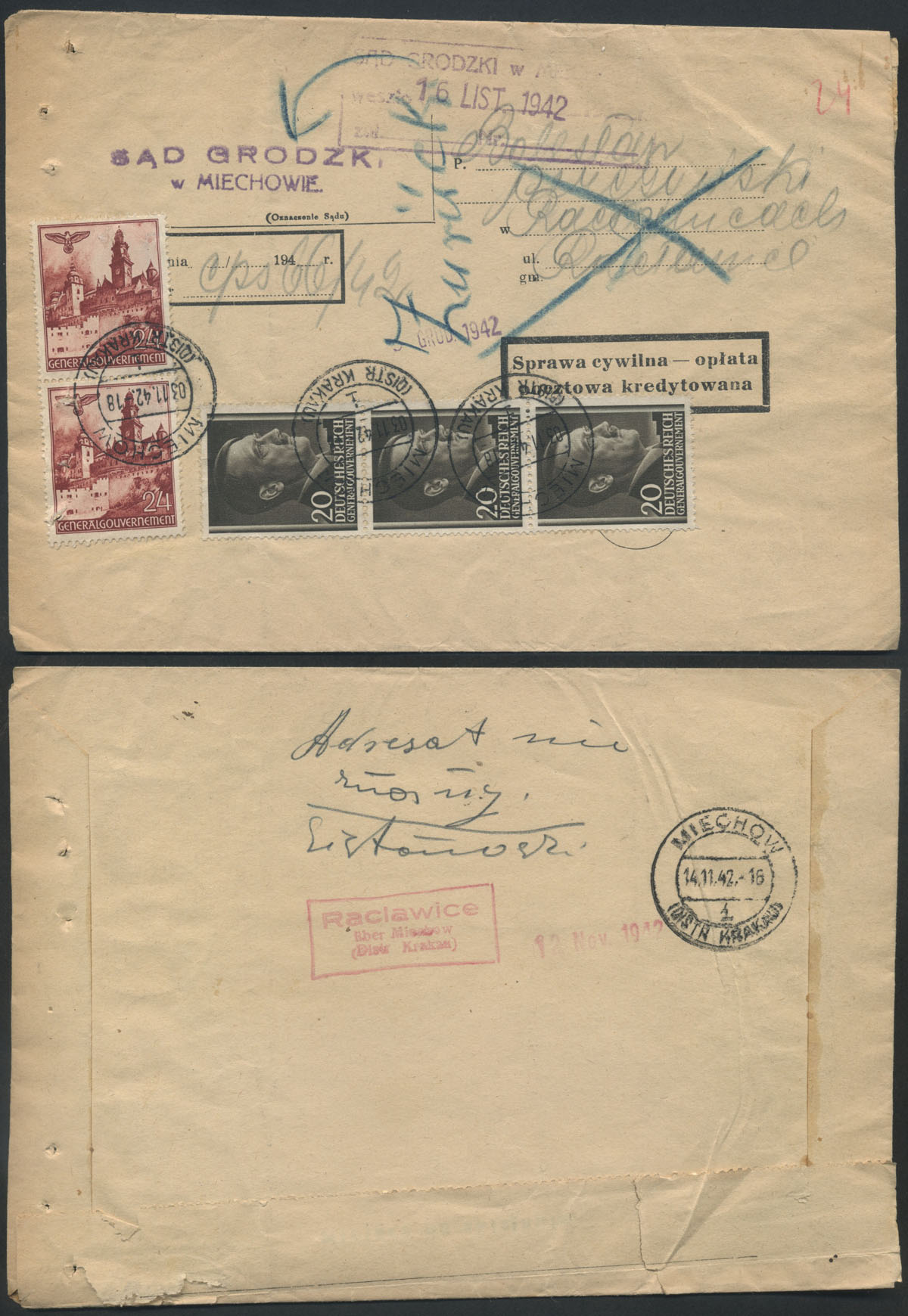 1942 list sadowy z Miechowa do Racławic, na odwrocie stempel odbiorczy pośrednictwa pocztowego w Racławicach. | Fi.45, 77 |
