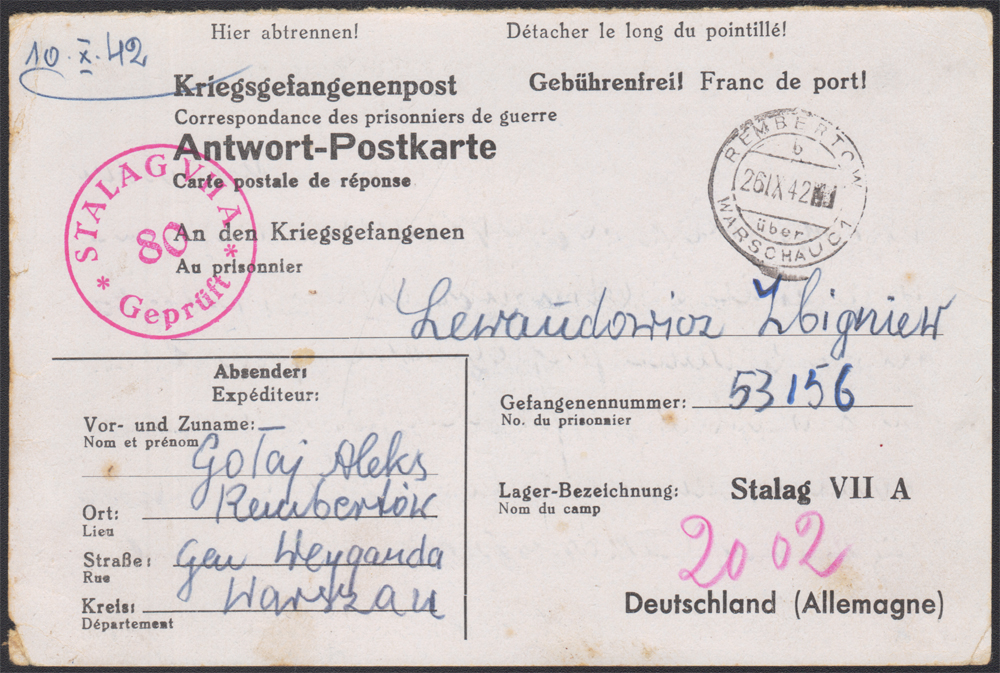 1942 karta-formularz "na odpowiedź" z Rembertowa do obozu jenieckiego Stalag VIIA wysłana 26.IX, bardzo ładnie odciśnięty dwuobrączkowy mały datownik "REMBERTOW über WARSCHAU C1" z wyróżnikiem "b" nad mostkiem; stempelek cenzora obozowego nr.80; dobry stan zachowania. | |