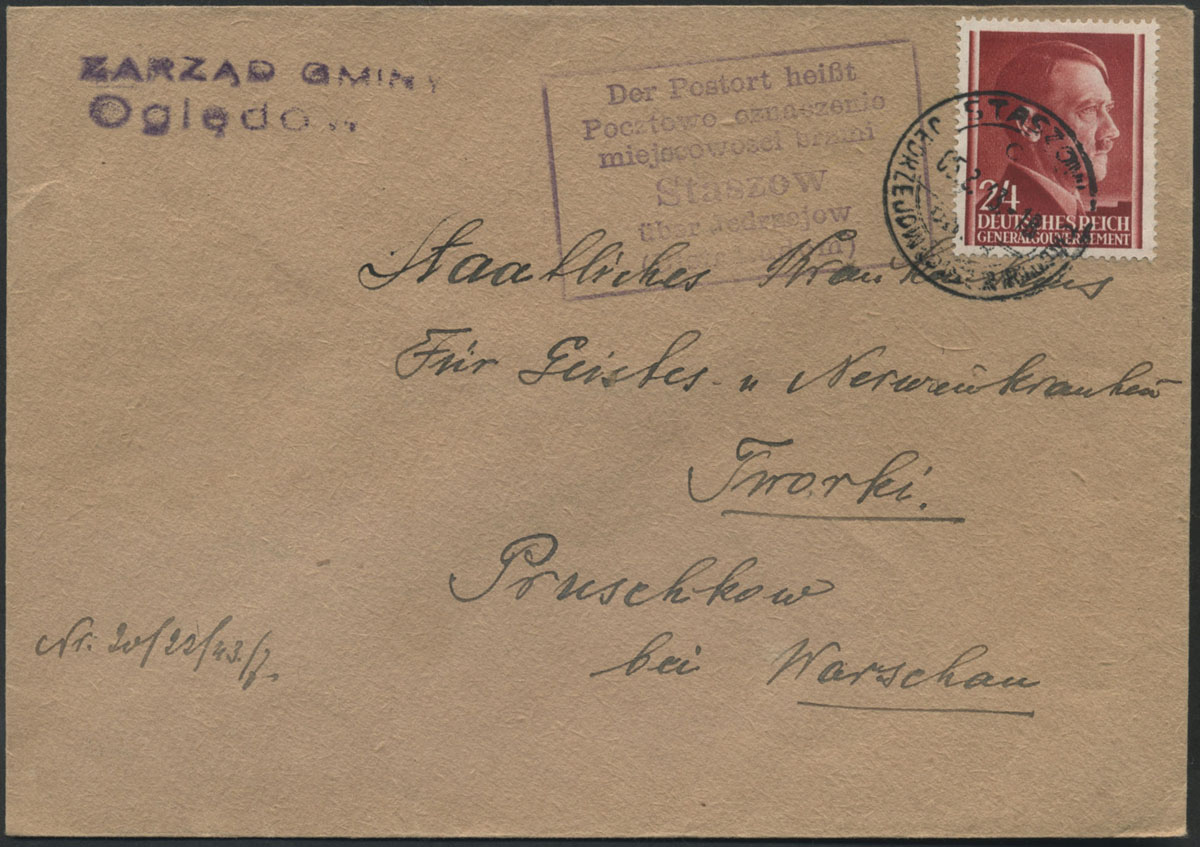 1943 list nadany z pośrednictwa pocztowego w Staszowie przez urząd zwierzchni w Radomiu do szpitala w Tworkach, stempel pośrednictwa. | Fi.78 |