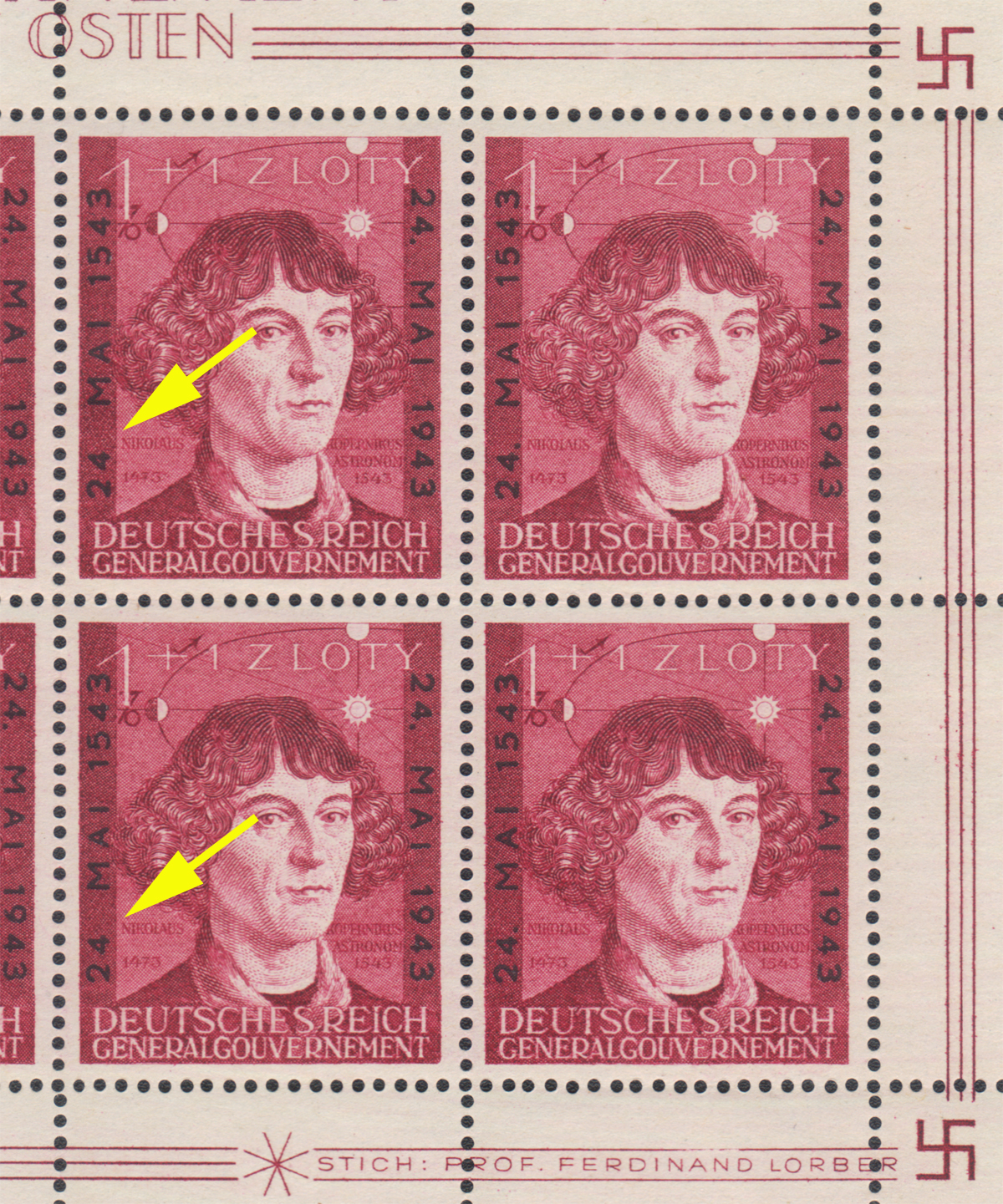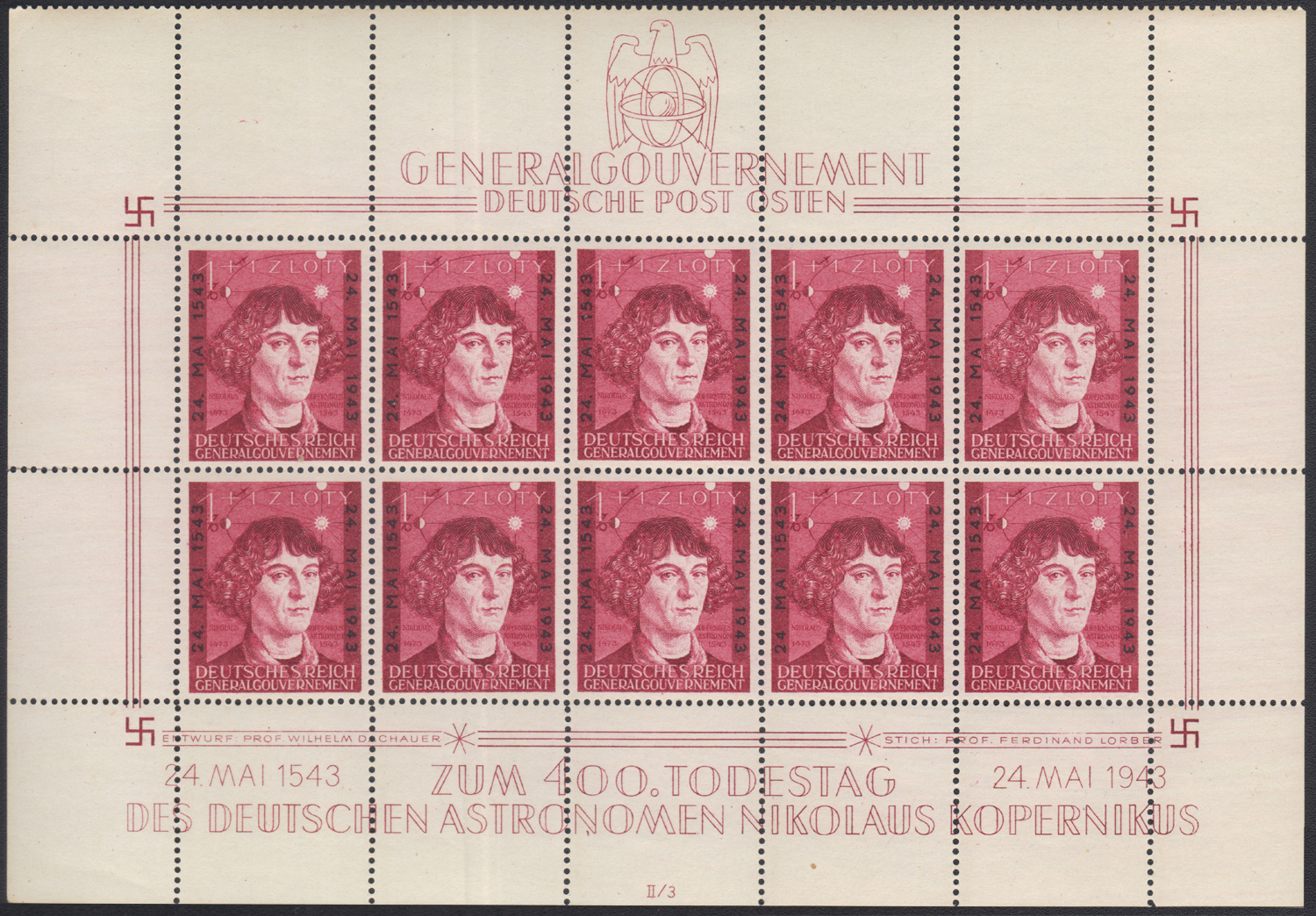 1943 Mikołaj Kopernik - 400 lecie śmierci, arkusik - sektor II/3 z błędami na poz. 4 i 9 "brak kropki po 24 w dacie śmierci" (Fi.900.-) oraz dodatkowo z pustopolami na górnym marginesie. | Fi.Ark.104I B2 Pw |