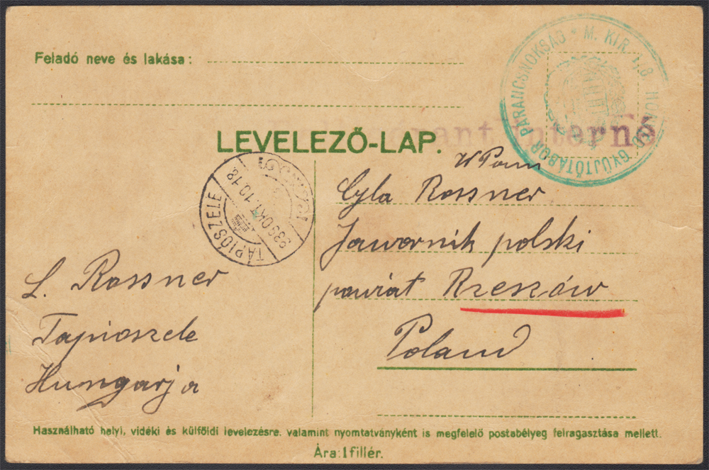 1939 Internowanie na Węgrzech - obóz Tapioszele, formularz wysłany 10.X z obozu do miejscowości Jawornik Polski, węgierski datownik nadawczy TAPIOSZELE, dwie pieczęci obozowe: okrągła z godłem i napisem "M.KIR. I/8 HONVED GYUJTOTABOR PARANCSNOKSAG" i jednowierszowa "Belligerant interne"; walor z bardzo wczesnego okresu funkcjonowania obozu w dobrym stanie zachowania (lewy dolny narożnik złamany). | |