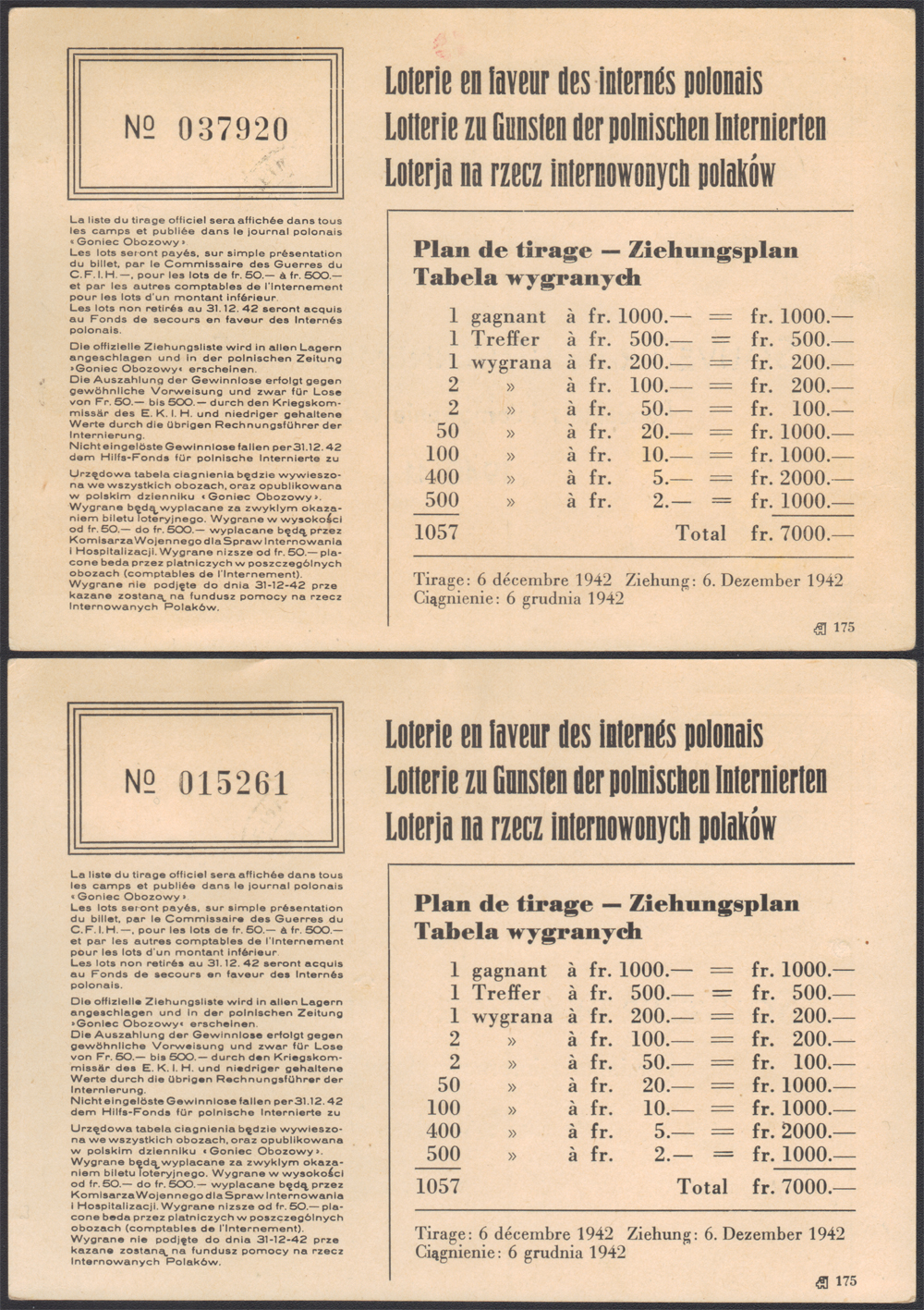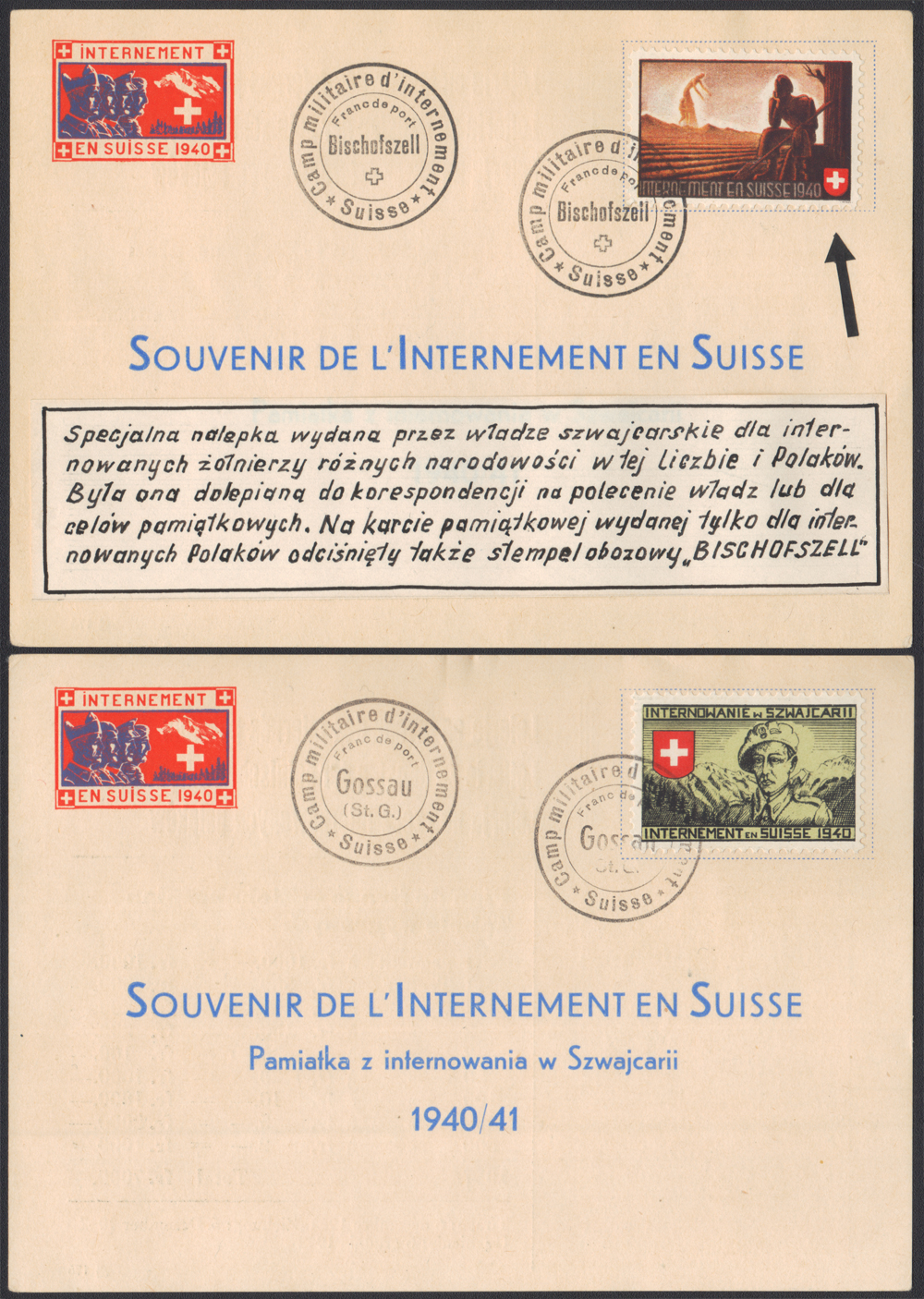 1940 Internowanie w Szwajcarii - 2 formularze "Pamiątka z internowania w Szwajcarii" będące zarazem losami na loterię na rzecz internowanych Polaków, ze znaczkami poczty polowej, ostemplowane w obozach: Bischofszell, Gossau (St.G.); dobry stan zachowania (na jednej z kart doklejono punktowo metryczkę z opisem). | Fi.1-2, Fp5 |