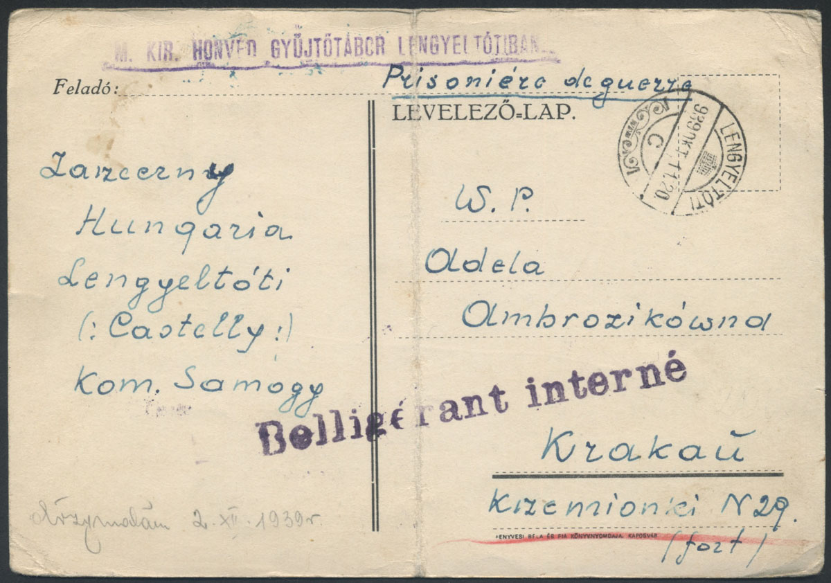 1939 internowanie na Węgrzech, kartka od polskiego żołnierza internowanego w Lengyeltóti wysłana 11.10.39 do Krakowa, kartka zagięta w pionie. | |