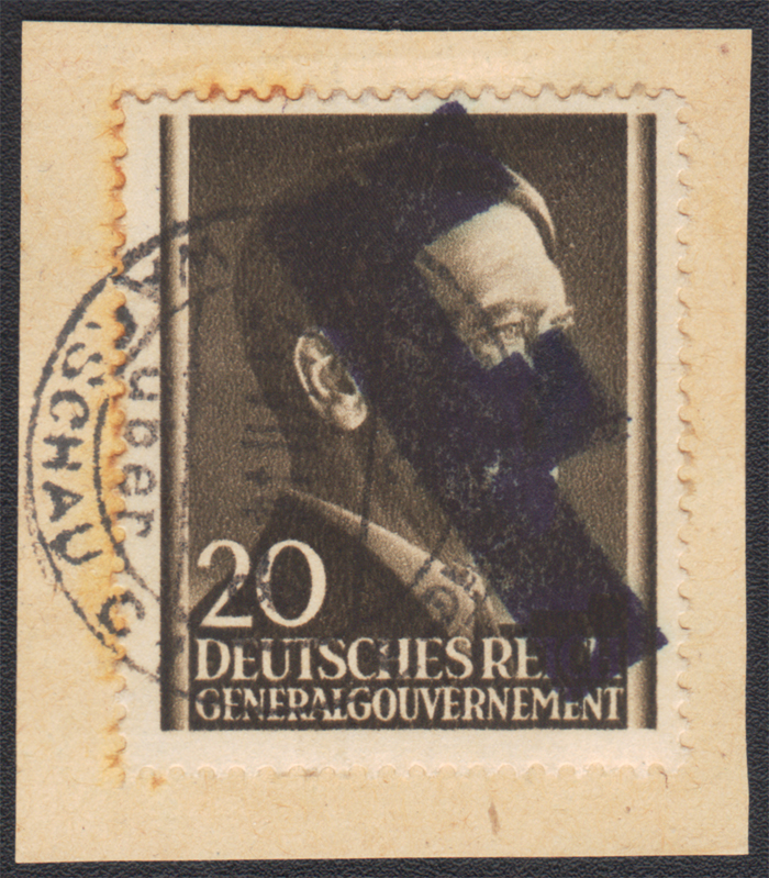 1944 Falenica - wydanie prowizoryczne, kasowany na wycinku znaczek za 20 gr. z nadrukiem ręcznym stempelkiem gumowym dużej litery "F" o wymiarach 11x22,5 mm, jest oryginalny, w kolorze czarnofioletowym (fałszywe odbijano w kolorze czarnym), do obiegu nie doszły, kasowane spotyka się bardzo rzadko, częściej jako czyste bez gumy, gwarancja na odwrocie. | Fi.5 |