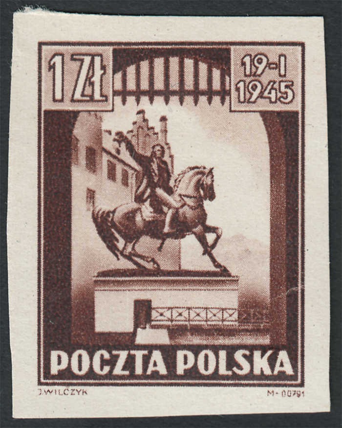 1945 zabytki Krakowa - pomnik T.Kościuszki, próba znaczka za 1 zł. w kolorze ciemnobrązowym na papierze białym cienkim satynowanym ??? bez gumy, gwarancja i oznaczenie Walocha. | Fi.363x2 P1 Mi.394 |