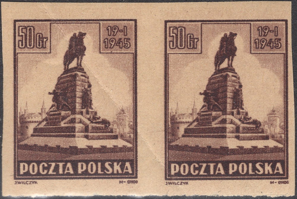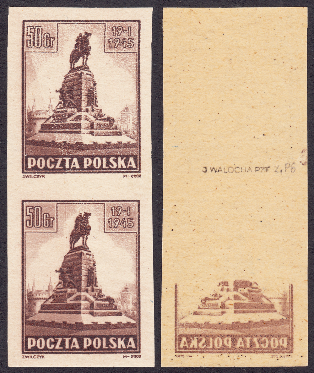 1945 wydanie obiegowe - zabytki Krakowa, Pomnik Grunwaldzki, parka prób znaczka za 50 gr. z napisem J.WILCZYK, na papierze drzewnym szarożółtym grubym gąbczastym, z dużym częściowym abklatschem na odwrocie dolnego znaczka, gwarancja i opis Walocha. | Fi.362z1 P6 Mi.393 U |