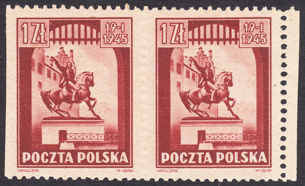 1945 zabytki Krakowa - pomnik T.Kościuszki, parka makulatury znaczków za 1 zł. na niebieskoszarym szorstkim drzewnym papierze, z zanikającą perforacją pionową między znaczkami, po lewej stronie arkusza nie było jej wcale, tu jest ledwo widoczna pomiędzy znaczkami, a na lewym marginesie prawidłowa, bardzo nietypowy walor, gwarancja i oznaczenie "MK pap y" Walocha. | Fi.363y MK Mi.394Us |