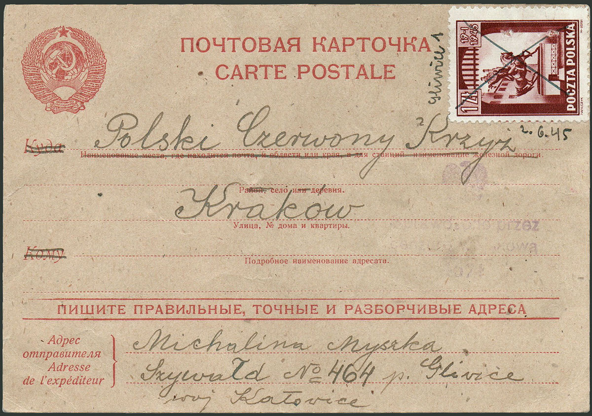 1945 radziecka całostka wysłana do Krakowa, odręcznie skasowany znaczek z adnotacją "Gliwice 1 / 2.6.45", słabo odbity stempel cenzury wojskowej nr 1671. | Fi.363 |