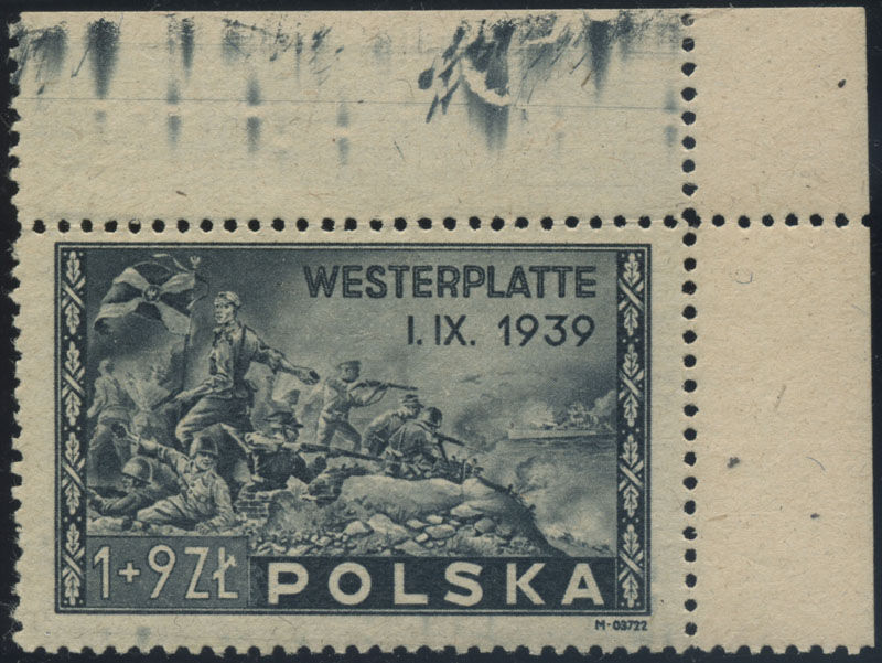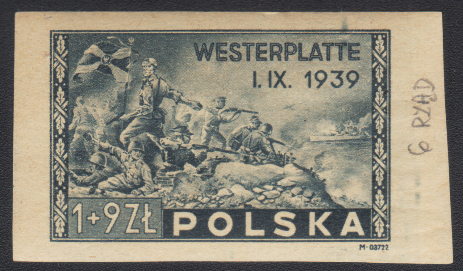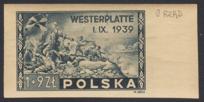 1945 Westerplatte, marginesowy cięty znaczek za 1+9 zł. - fałszerstwo z 6 rzędu nadużytej formy - co odpowiada poz.28 oryginalnej, do niedawna uważany za prawdziwy. | Fi.374 nz FFi Mi.407 U |