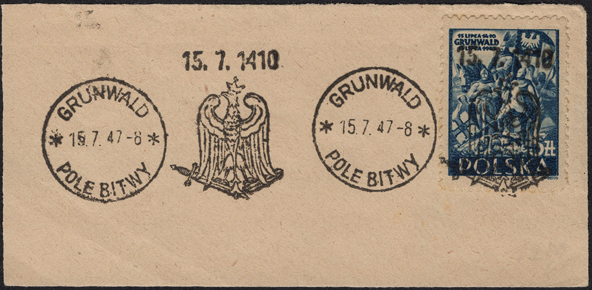 1945 "535. ROCZNICA BITWY POD GRUNWALDEM" znaczek skasowany okolicznościowo na karcie 15.VII w rocznicę bitwy (Myślicki 45 007 + 202). | Fi.372, Cp95 Mi.405 |