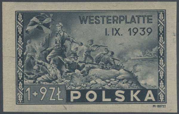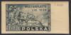 1945 6. rocznica walk o Westerplatte, próba o nieco cieńszym papierze z wyjątkowo starannym drukiem charakterystycznym dla próbnych odbitek przed rozpoczęciem druku znaczków definitywnych, gdzie następuje stopniowe zużycie formy, gwarancja i oznaczenie Walocha. | Fi.374P1 Mi.407U (Proof) |