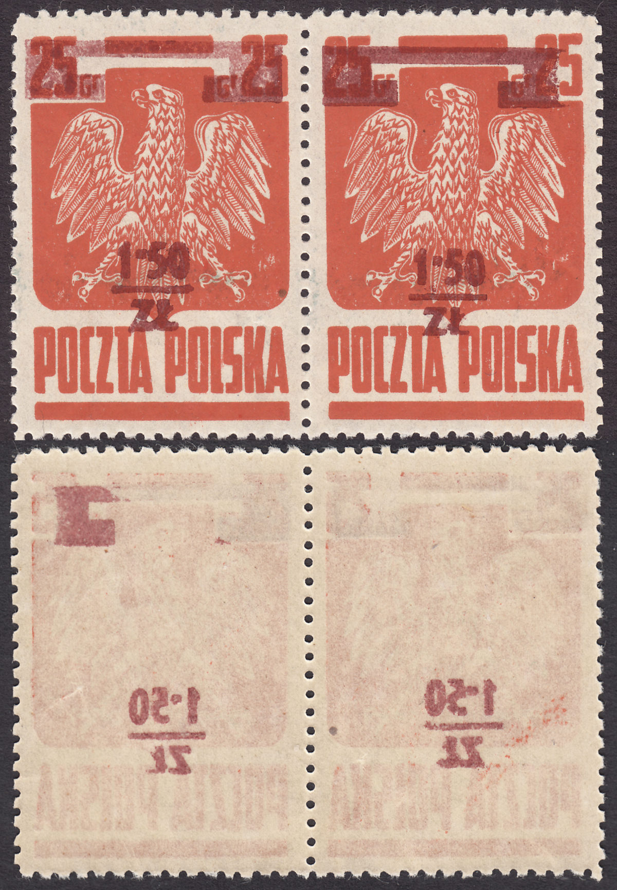 1945 wydanie przedrukowe, parka znaczków za 1,50 zł./25 gr., lewy znaczek ze słabo odbitą belką, prawy z brzegowym uszkodzeniem belki, oba z rzadkim - jako częściowy, abklatschem nadruku, ostatnio nie było takiego znaczka na aukcji, nie jest gwarantowany bo będzie eksponowany od strony gumy. | Fi.376a Mi.409b |