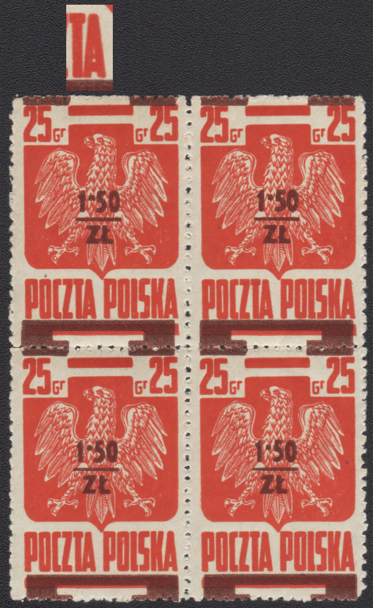 1945 wydanie przedrukowe, czworoblok makulaturowych znaczków za 1,50 zł./25 gr. w kolorze brązowoczerwonym z przesuniętym w górę nadrukiem II formy poz.46/57, lewy górny znaczek z błędem znaczka podstawowego z poz.46 I formy typograficznej "dwie poprzeczki litery A", gwarancja i oznaczenie MK Walocha. | Fi.376a MK B Mi.409b |