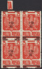 1945 wydanie przedrukowe, czworoblok z nadrukiem I formy, nadruk przesunięty do góry, wchodzący już na znaczek u góry, abklacz części rysunku znaczka na stronie gumowanej, gwarancja Berbeka - ładna komasacja błędów. | Fi.376a Mi.409B |
